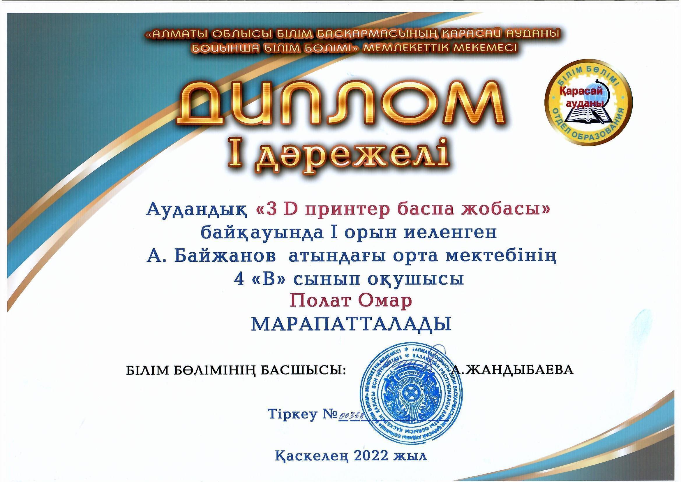 I дәрежелі диплом, Полат Омар » А.Байжанов атындағы орта мектеп