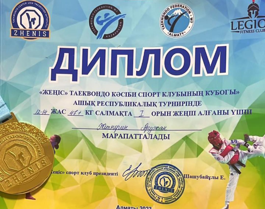 "Жеңіс" "Таеквондо кәсіби спорт клубының кубогы"ашық Республикалық турнигінде 12-14 жас 47 кг салмақта l орынды жеңіп алған 8" А"сынып оқушысы Жеткерген Аружан