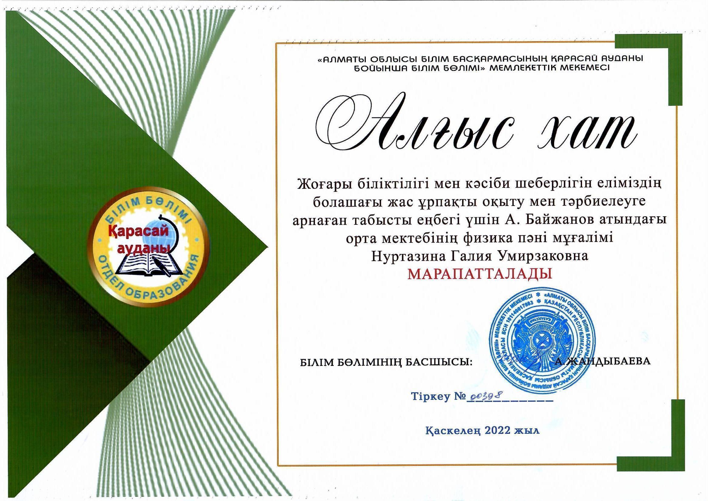 Алғыс хат аудандық білім бөлімі » А.Байжанов атындағы орта мектеп